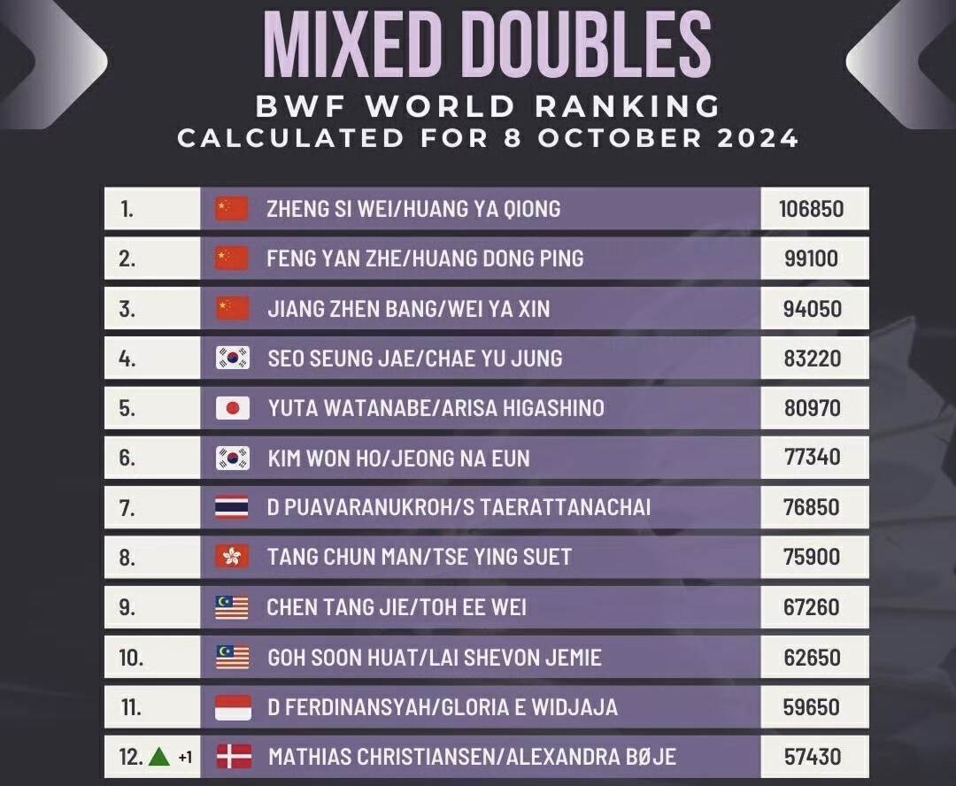 日前,国羽时隔12年再次包揽一起单项宇宙第一的音信,激发外界温雅。据宇宙羽联官方平台显现,中国队在男女单以及三个双打面貌名次榜首。男单宇宙第一为宇宙冠军石宇奇,女单则是奥运冠军陈雨菲。男双宇宙第一为巴黎奥运亚军得主梁伟铿和王昶,女双和混双宇宙第一分裂是陈早晨和贾一凡、郑念念维和黄雅琼。